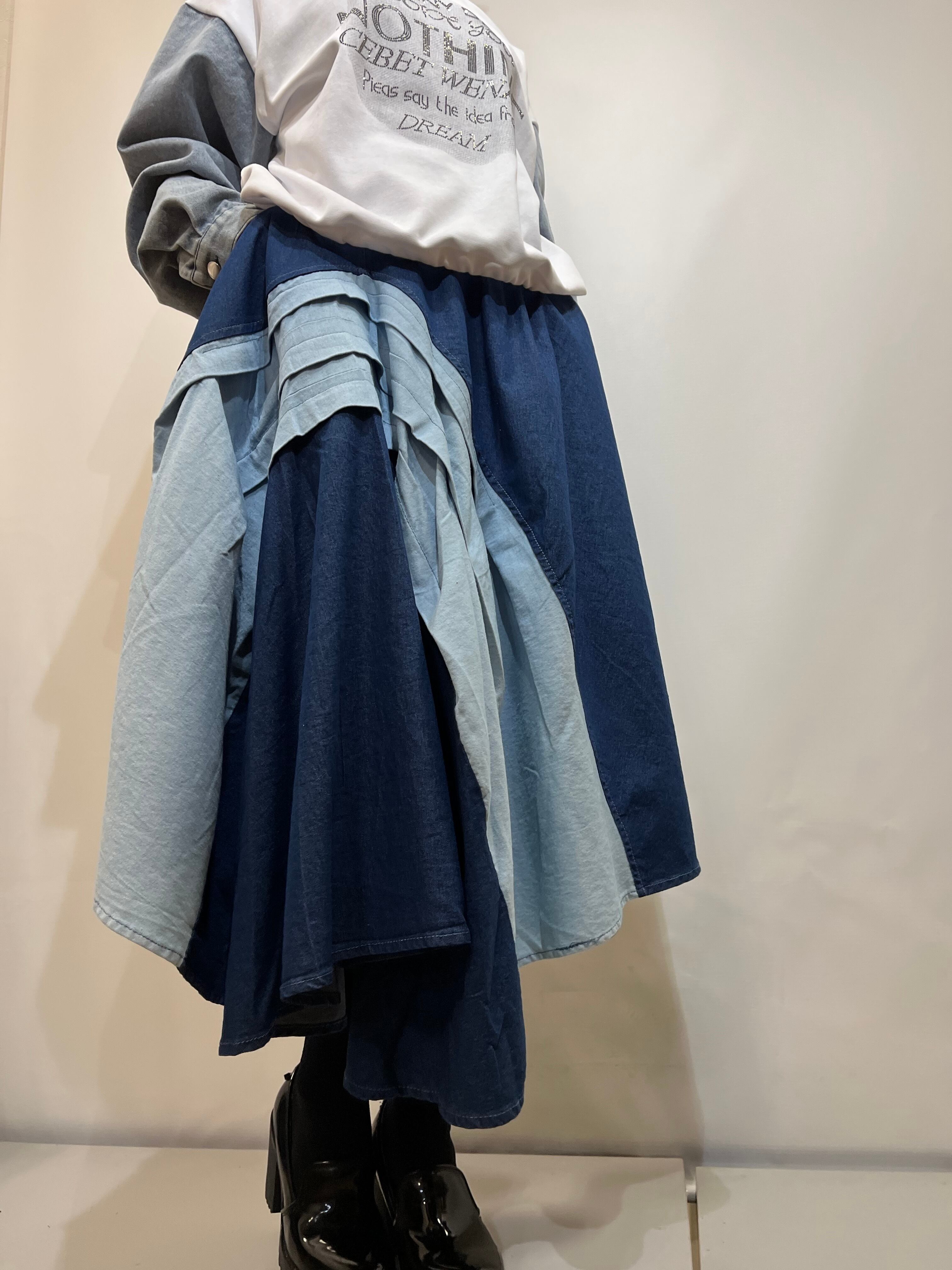 (≧▽≦)☆デニムの濃淡生地とアシメトリーデザインが特徴のエスカルゴ風スカート!個性的なシルエットが際立ち、特別な日からカジュアルなシーンまで幅広く活躍する一品です♪
