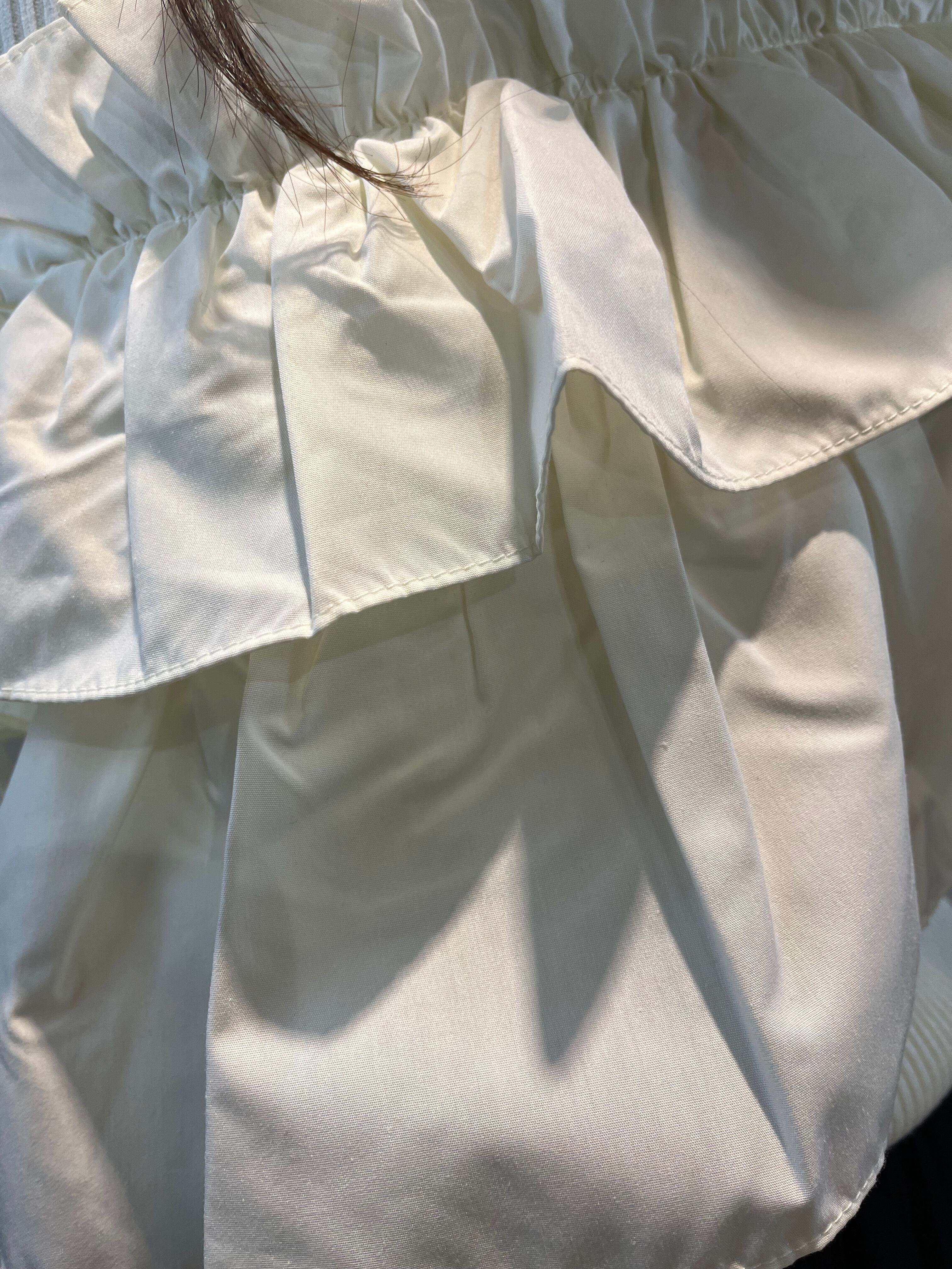 リブの柔らかさと布帛ギャザーフリルのフェミニンなコントラストが心を惹きつけます!前後のギャザーフリルがさりげなく動きを与え、デイリースタイルから特別なシーンまで幅広くコーディネート可能です。このトップスは、カジュアルなランチからおしゃれなディナーまで、さまざまなシーンで活躍すること間違いなしです。