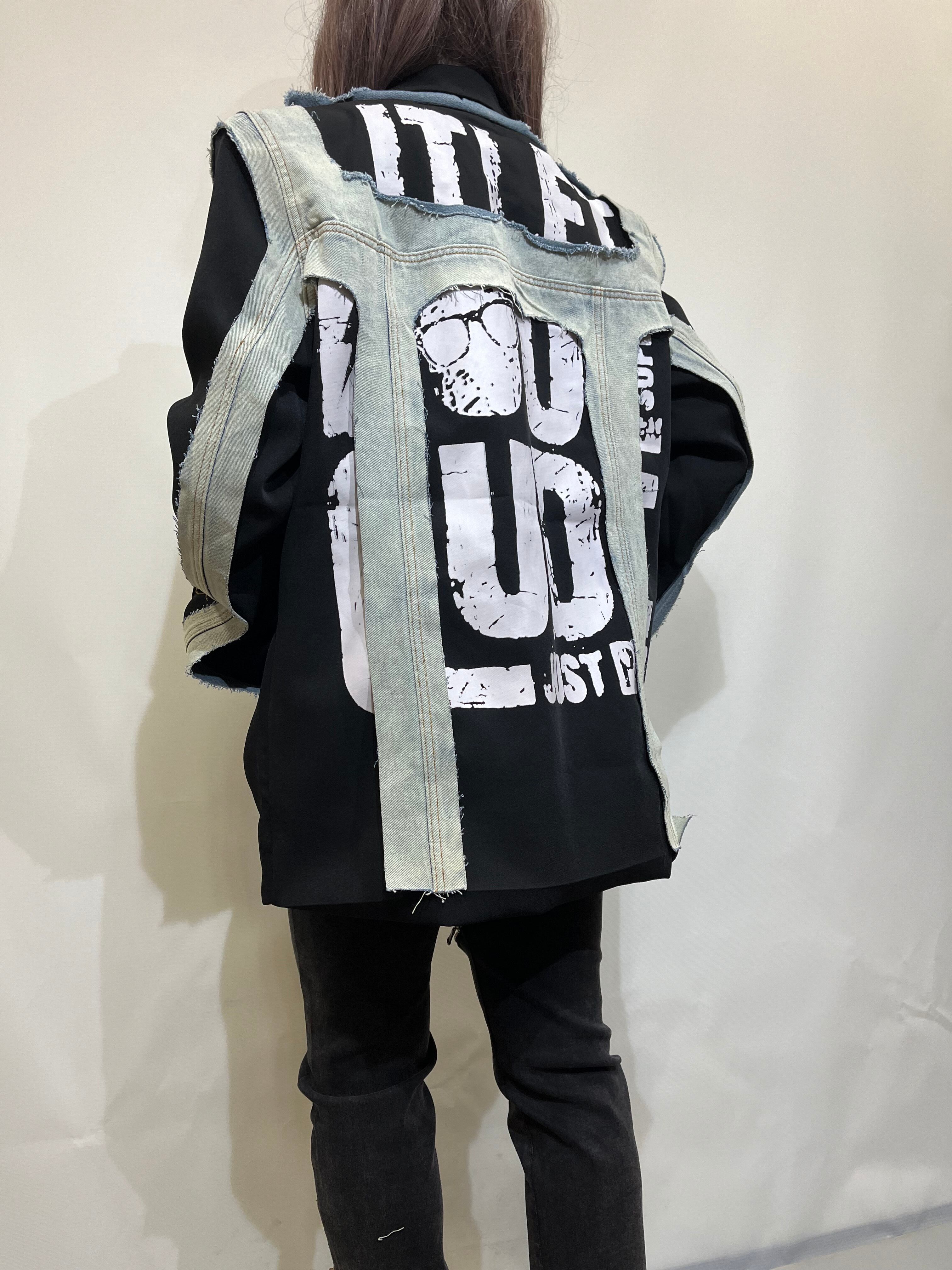 (≧▽≦)☆カジュアルさとエレガンスが融合したロゴデニム切替テーラージャケット、洗練されたスタイルを手軽に楽しめます!